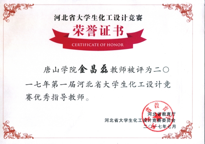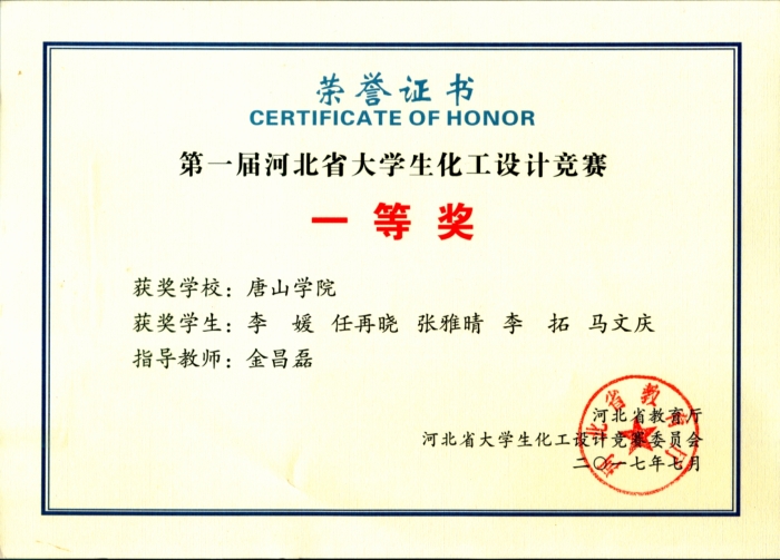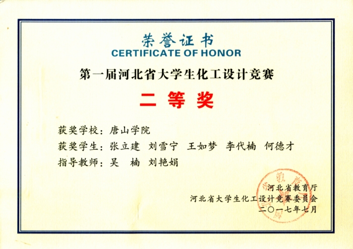 2017年7月27日至30日,由河北省教育厅主办,河北工业大学承办的“瀚普智慧杯”第一届河北省大学生化工设计竞赛决赛于在河北工业大学红桥校区东院举行。本次竞赛吸引了来自河北省24所高校的159支团队报名参加。经过现场答辩激烈角逐和专家委员会审核,bet28365365备用“唐院梦之队”团队获得一等奖,“青春畅想队”获得二等奖,金昌磊老师获得2017年第一届河北省大学生化工设计竞赛优秀指导教师称号。